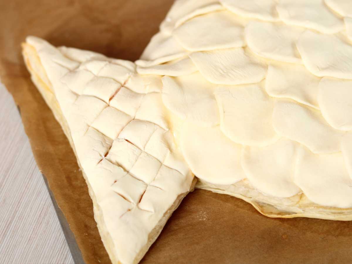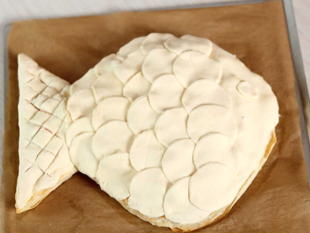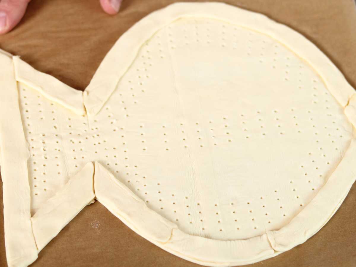 - Forma de pez: Cubre el relleno con la segunda lámina de hojaldre. Para darle forma de pez, corta los bordes del hojaldre siguiendo la forma de un pez (con una cabeza más ancha y una cola puntiaguda). Para simular las escamas, haz cortes en diagonal a lo largo del hojaldre, como se ve en la imagen y crúzalos en forma de trenza. Usa las aceitunas negras para formar los ojos del pez.