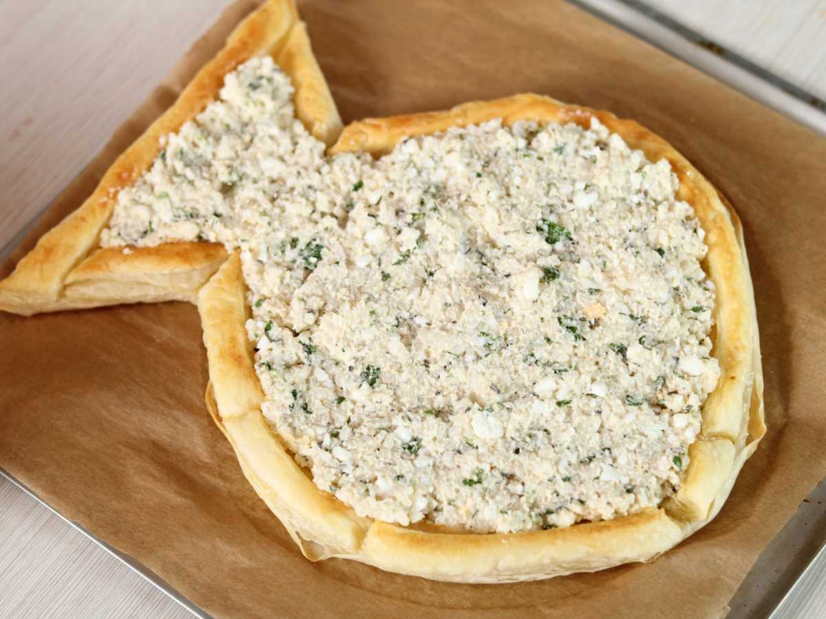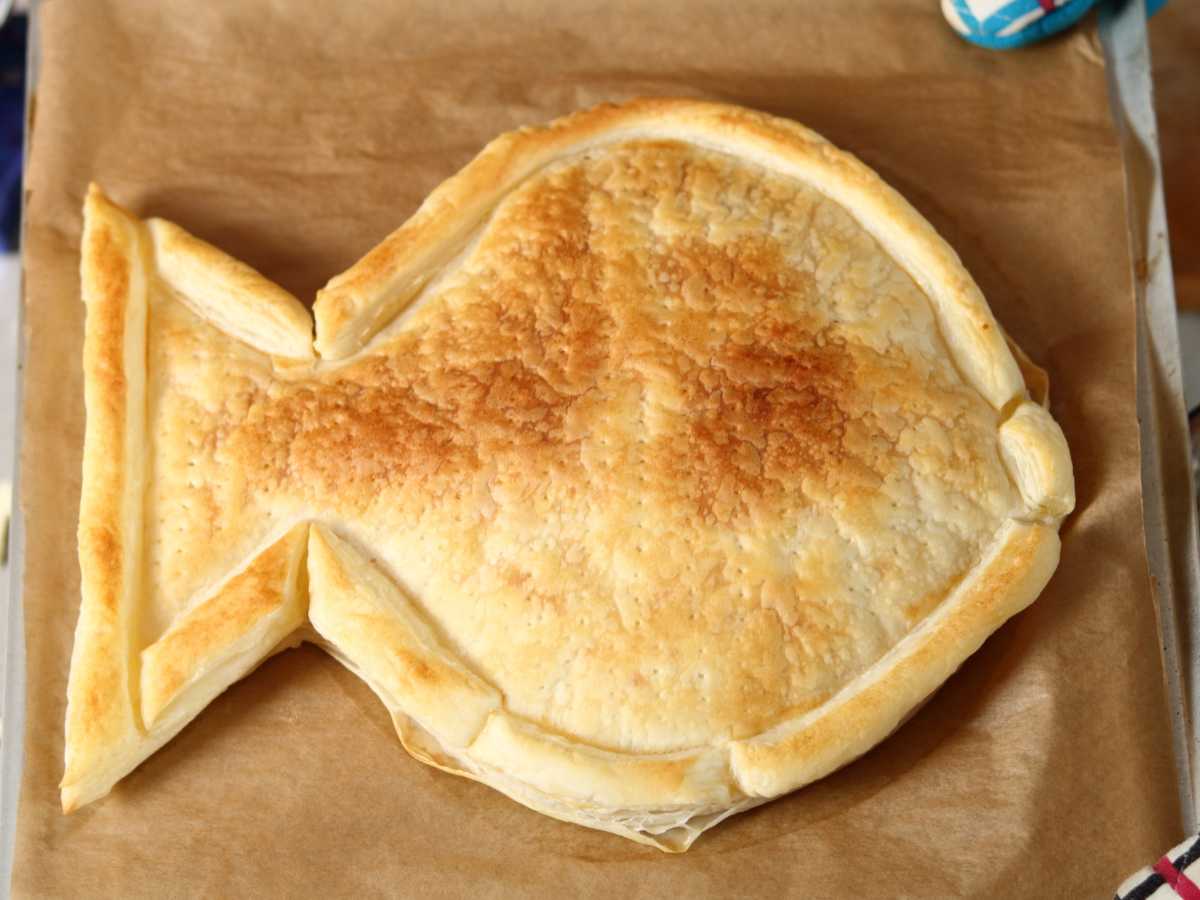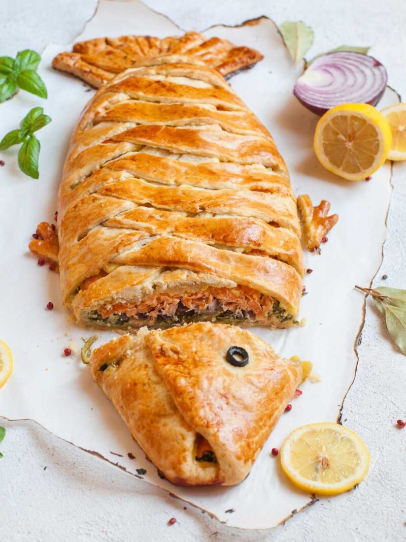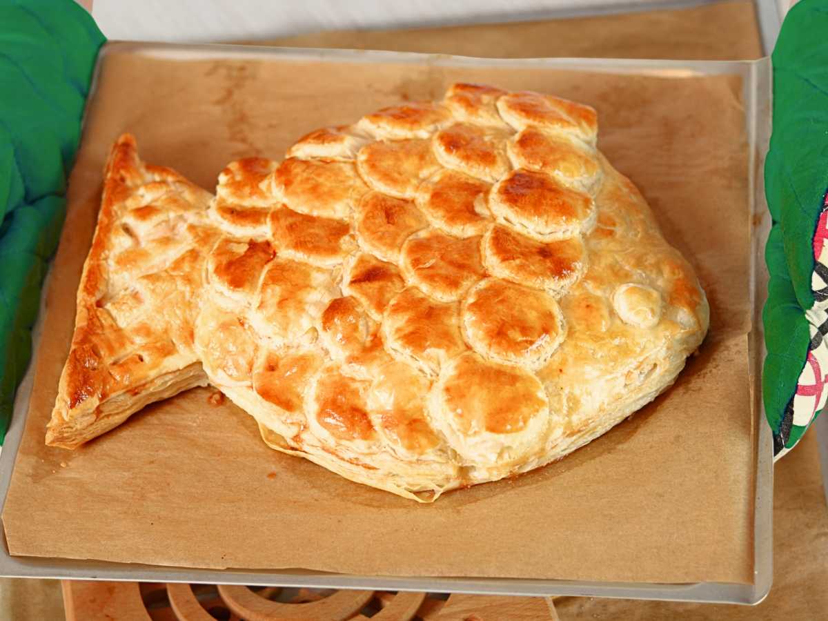 - Forma de pez: Cubre el relleno con la segunda lámina de hojaldre. Para darle forma de pez, corta los bordes del hojaldre siguiendo la forma de un pez (con una cabeza más ancha y una cola puntiaguda). Para simular las escamas, haz cortes en diagonal a lo largo del hojaldre, como se ve en la imagen y crúzalos en forma de trenza. Usa las aceitunas negras para formar los ojos del pez.