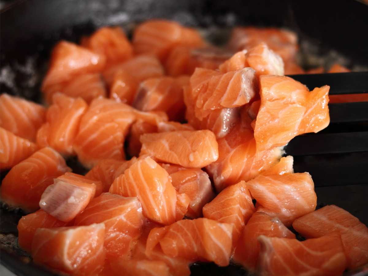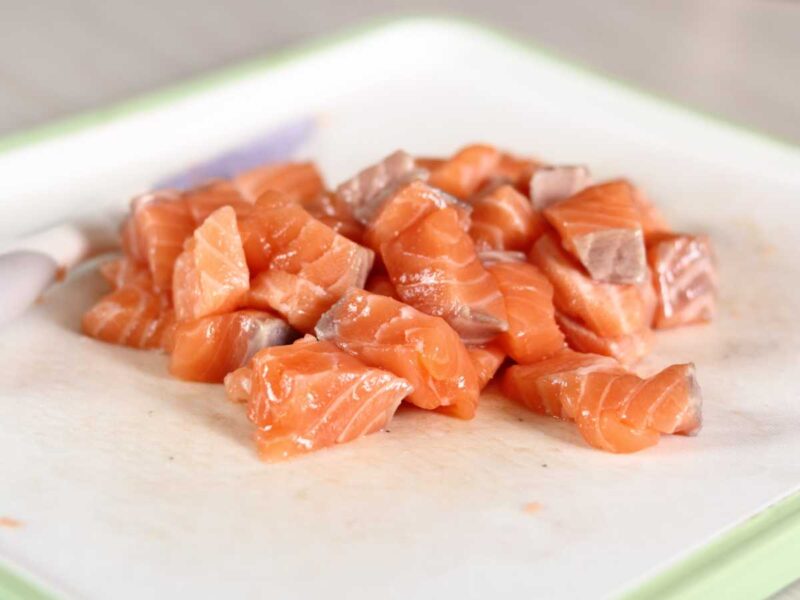 - Prepara el salmón: Corta el salmón en dados o en tiras, dependiendo del tamaño que prefieras para el relleno. No es necesario cocinarlo previamente, ya que se cocinará dentro del hojaldre.
