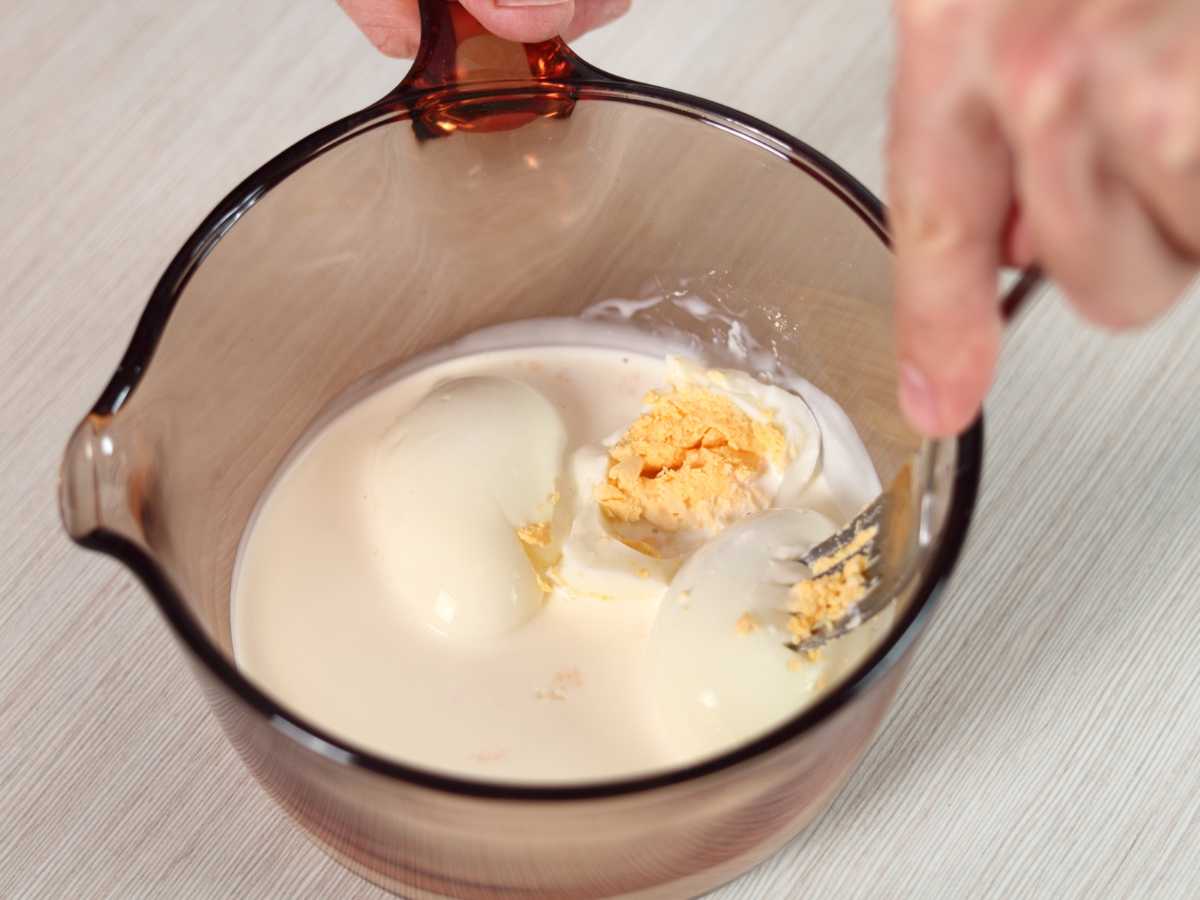 - En un bol, mezcla los huevos cocidos con la nata, y aplástalos con un tenedor mezclándolo todo.