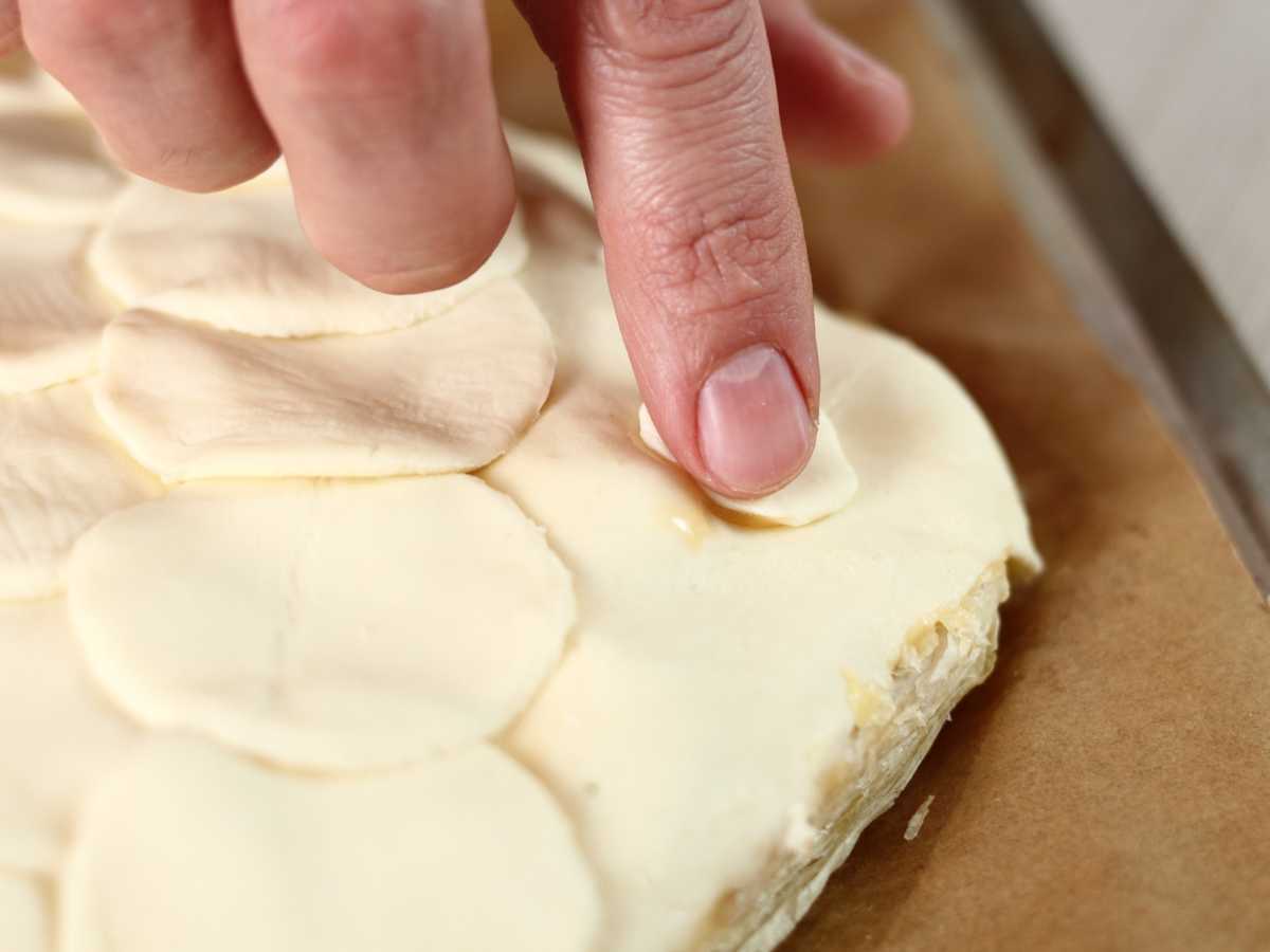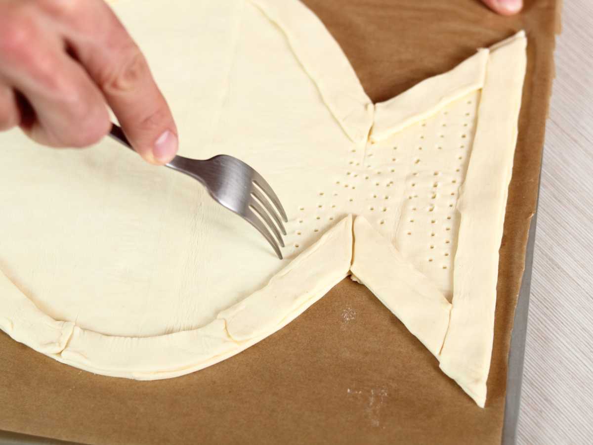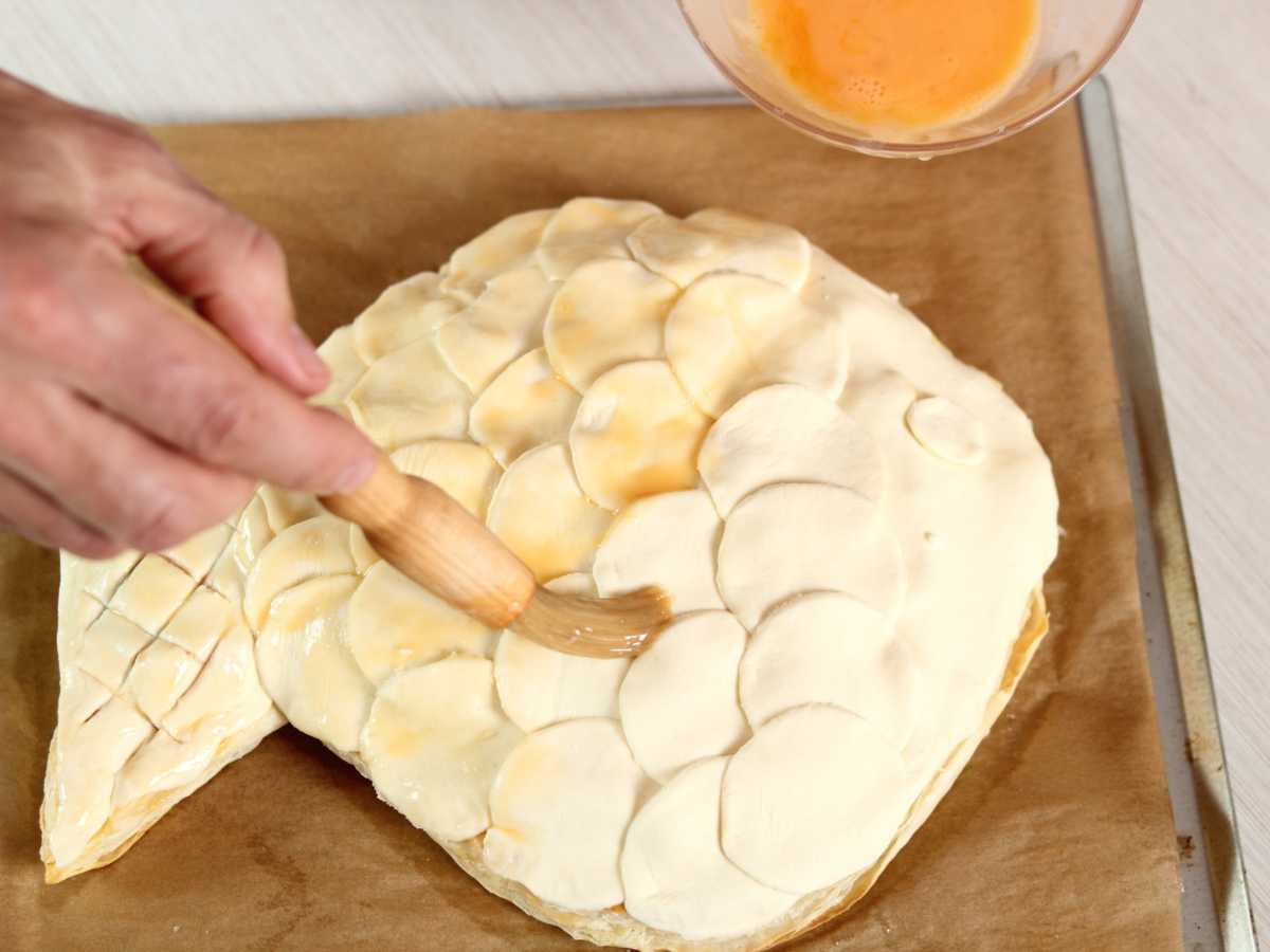- Sellar y pintar: Pinta todo el hojaldre con el huevo batido para que quede bien dorado y brillante.