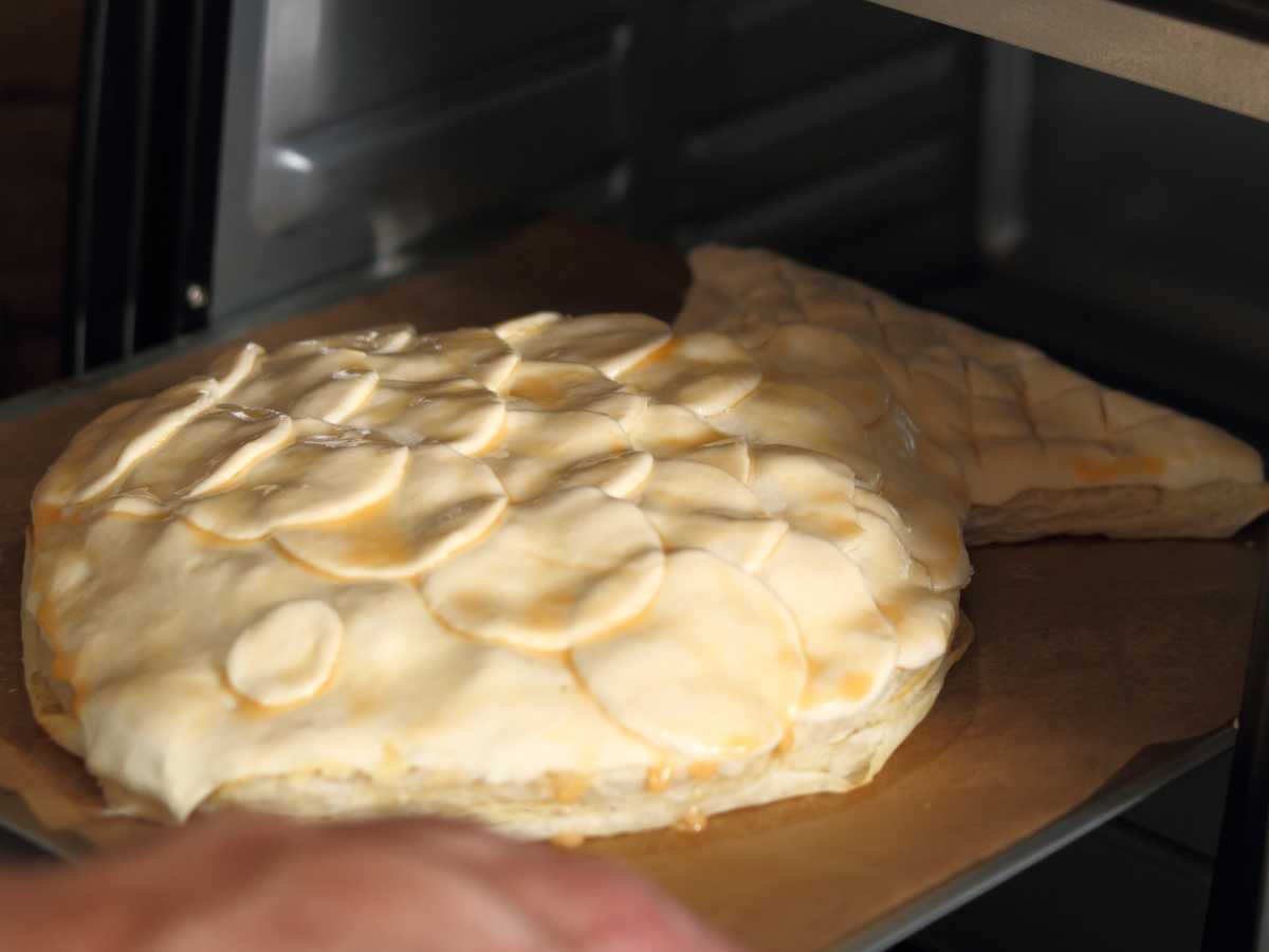 - Guarda el hojaldre sobrante y vuelve a estirarlo con el rodillo porque con él tienes que poner una tira de unos 5 cm alrededor del pez, tal como se ve en la imagen.