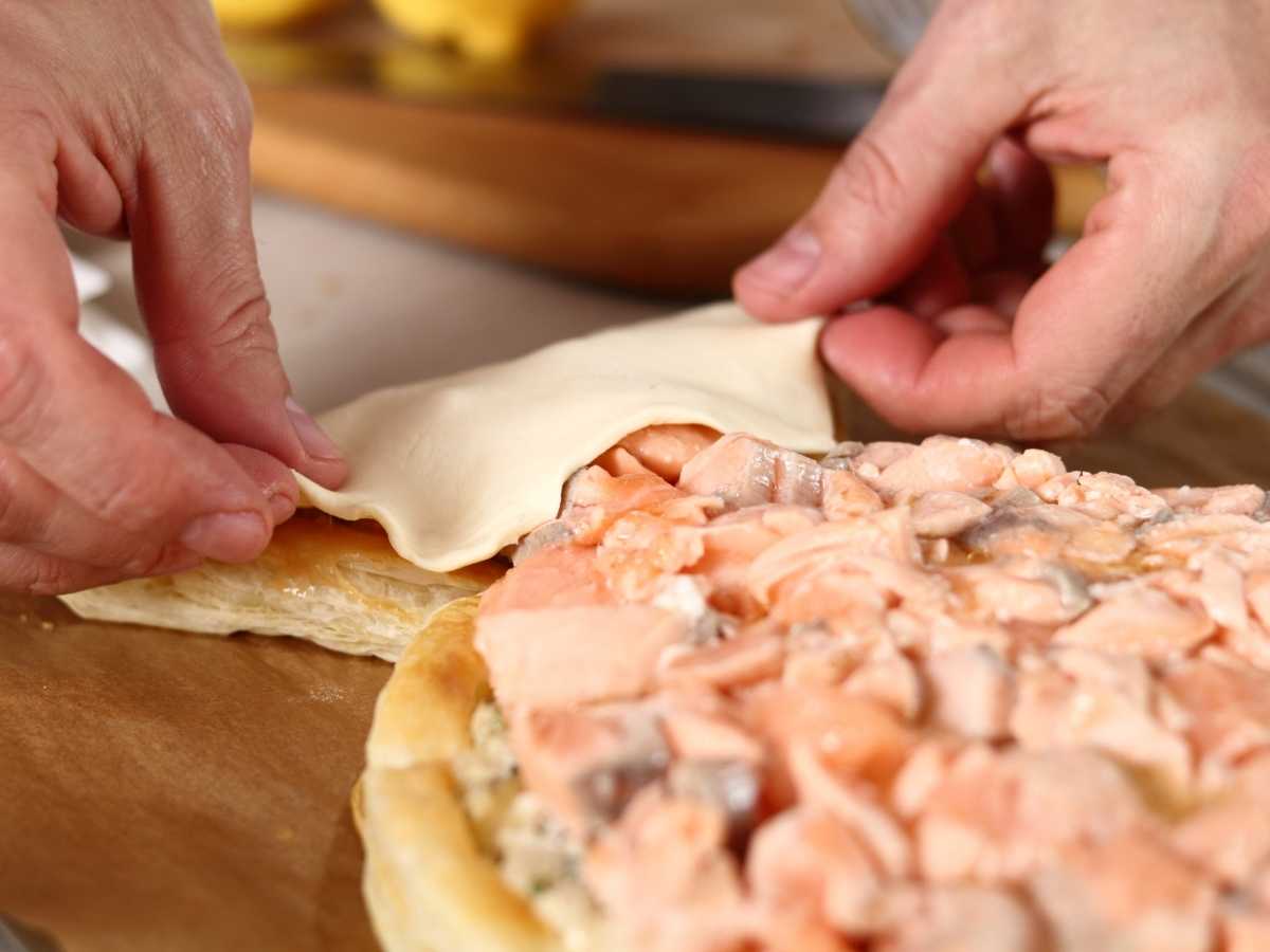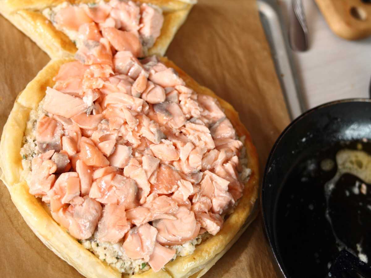 Vamos a preparar una receta que puedes hacer con salmón pero, si lo prefieres, puedes usar pescados blancos como la merluza o el bacalao, o también un hojaldre relleno de atún como ya te enseñamos a hacer.