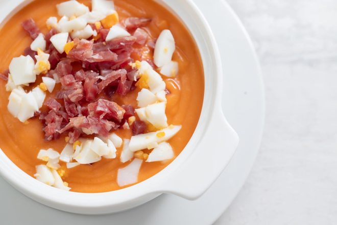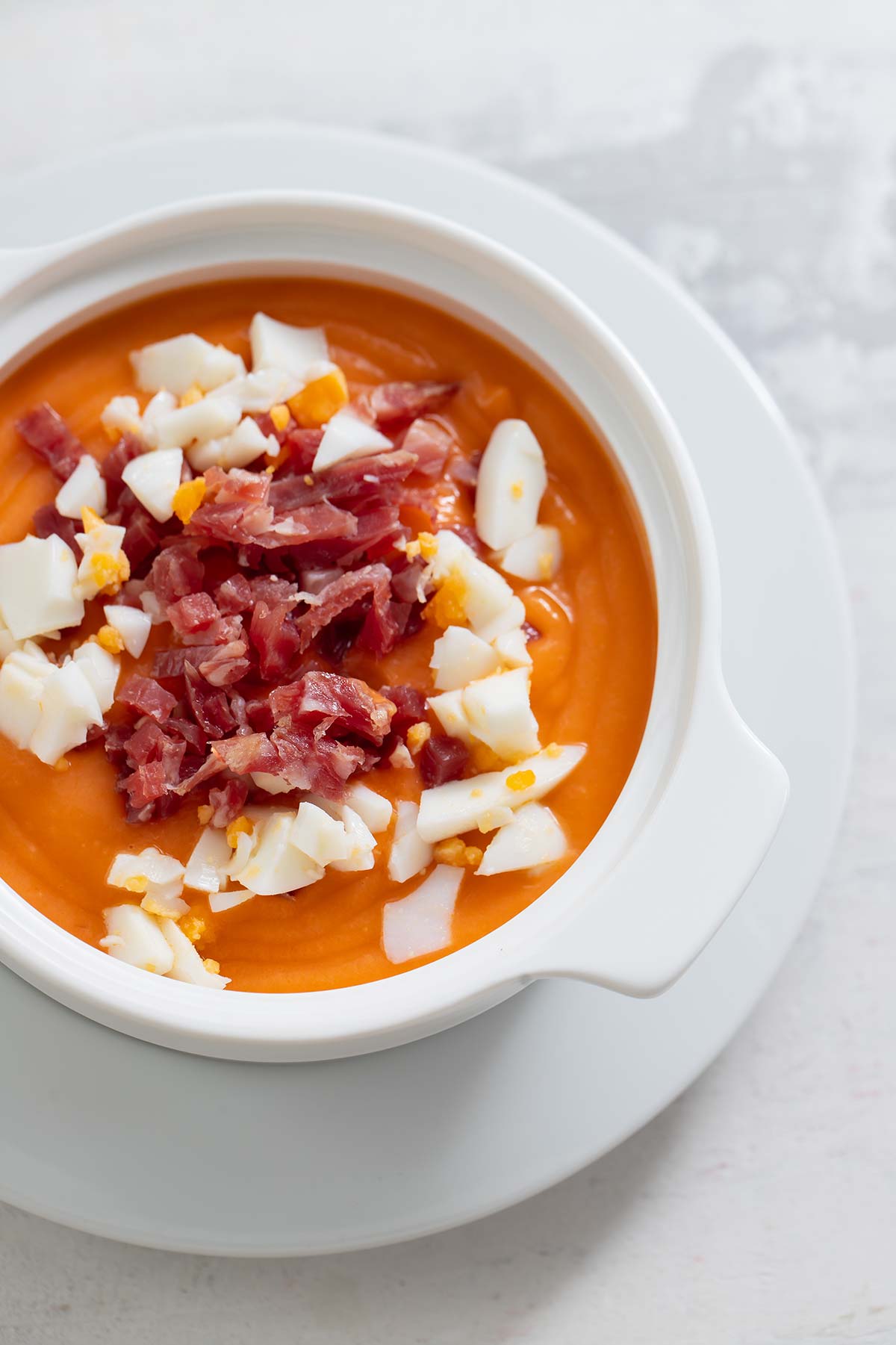 El salmorejo es más denso que el gazpacho, se toma con cuchara. Lo servimos frío en un cuenco o plato hondo, rociado con un chorrito de aceite de oliva, huevo picado y jamón serrano picado.