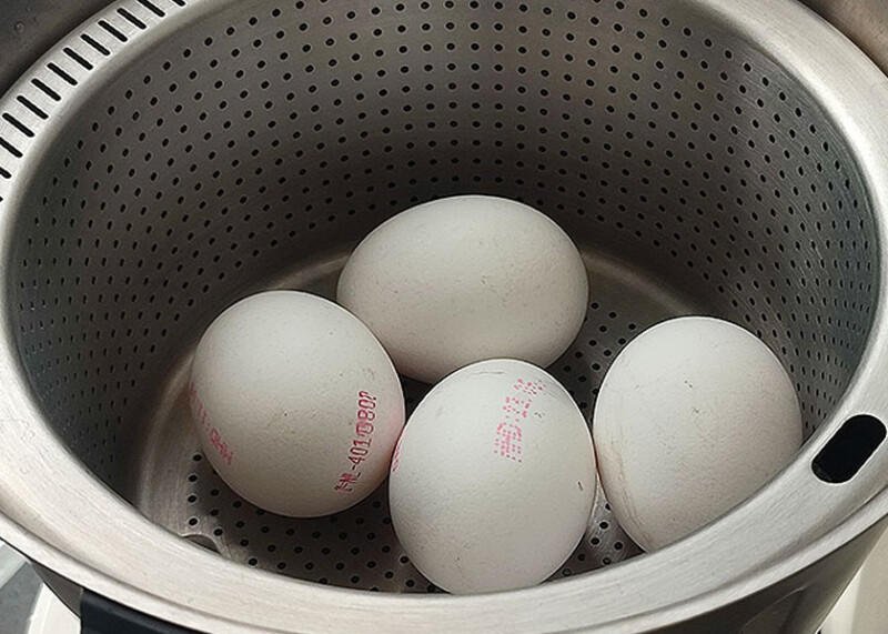 - En este caso ponemos 500 ml de agua en el vaso, ponemos el cestillo y los huevos en él (nosotros hemos cocido 4 huevos).