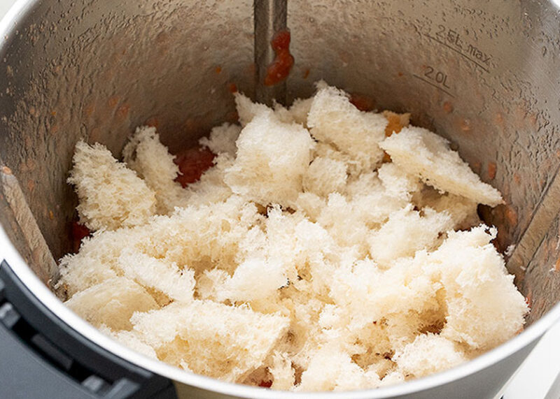 - Añadimos el pan y el vinagre y programamos 1 minuto, a velocidad progresiva 6-8.