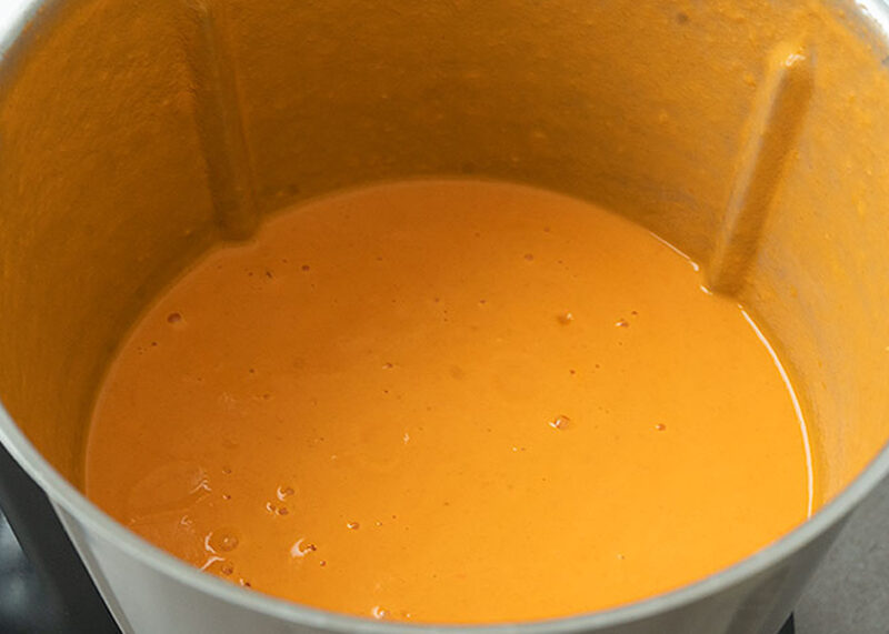 Si no quieres usar pan, prueba incorporando la misma cantidad de zanahoria. Tritura por más tiempo para que la zanahoria se integre bien y el salmorejo quede bien cremoso.