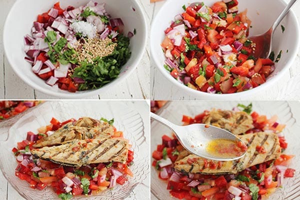 - Lavamos el pimiento y el tomate, cortamos en dados pequeños, al igual que la cebolla morada, ponemos en un recipiente y añadimos el zumo de medio limón.