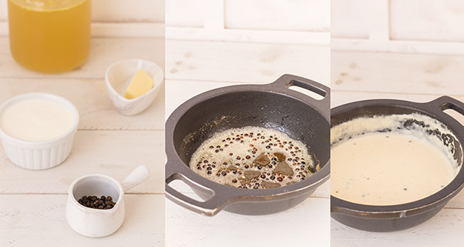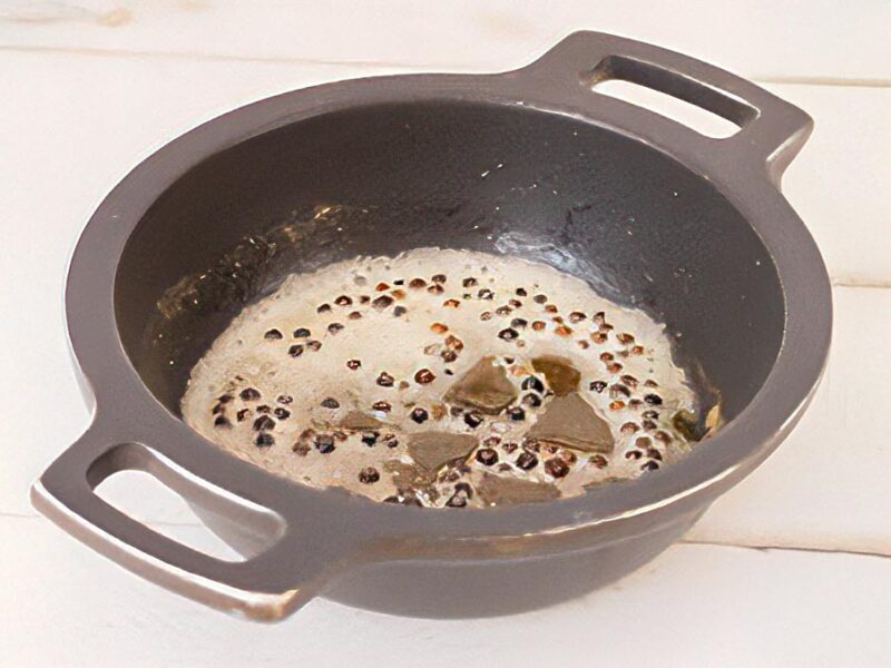 - Agregamos a la mantequilla una cucharada de pimientas variadas en grano y rehogamos durante dos minutos.