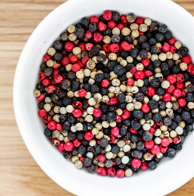 Para preparar la salsa a la pimienta fácil yo he utilizado un popurrí de pimientas variadas.
