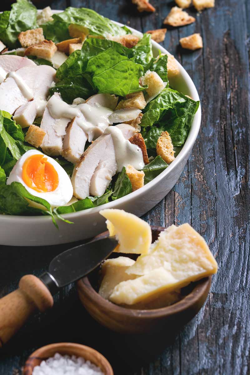 Y así una sencilla ensalada que básicamente se hace con lechuga, costrones de pan, queso parmesano y, opcionalmente pollo, se convierte en una delicia para los sentidos.