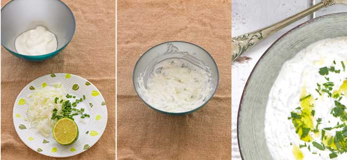 En este caso se trata de una salsa sencilla que se elabora con cebolleta, menta y lima, que se añaden al yogur griego.