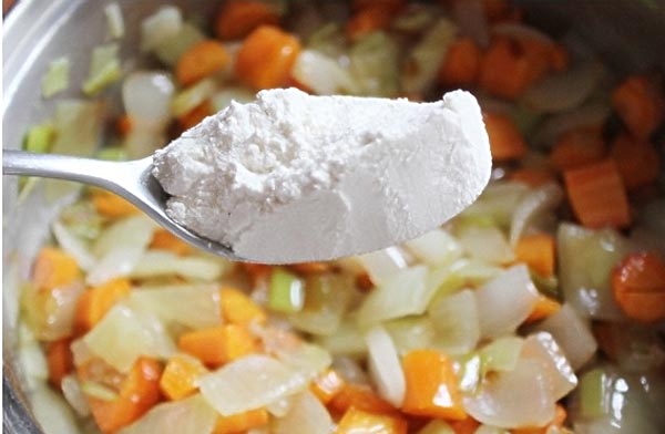 - Cuando comiencen a dorarse añadimos la harina, mezclamos y dejamos que se cocine.