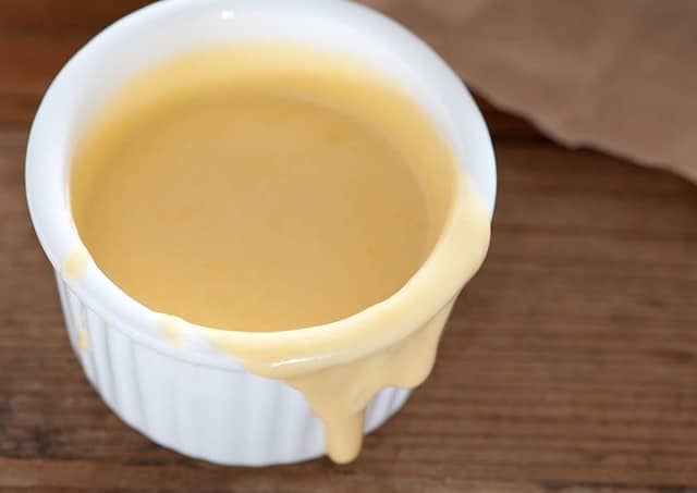 El primer paso es clarificar la mantequilla, es decir separar su parte grasa (alrededor del 80%) del agua que contiene. Para hacer nuestra salsa holandesa usaremos solo la parte grasa. Para clarificar la mantequilla la ponemos en un cazo y la calentamos a fuego muy bajo, nunca tiene que hervir (si tenéis un termómetro de cocina, no debe superar los 60°C). No la removemos ni nada, solo dejamos que se funda por completo.