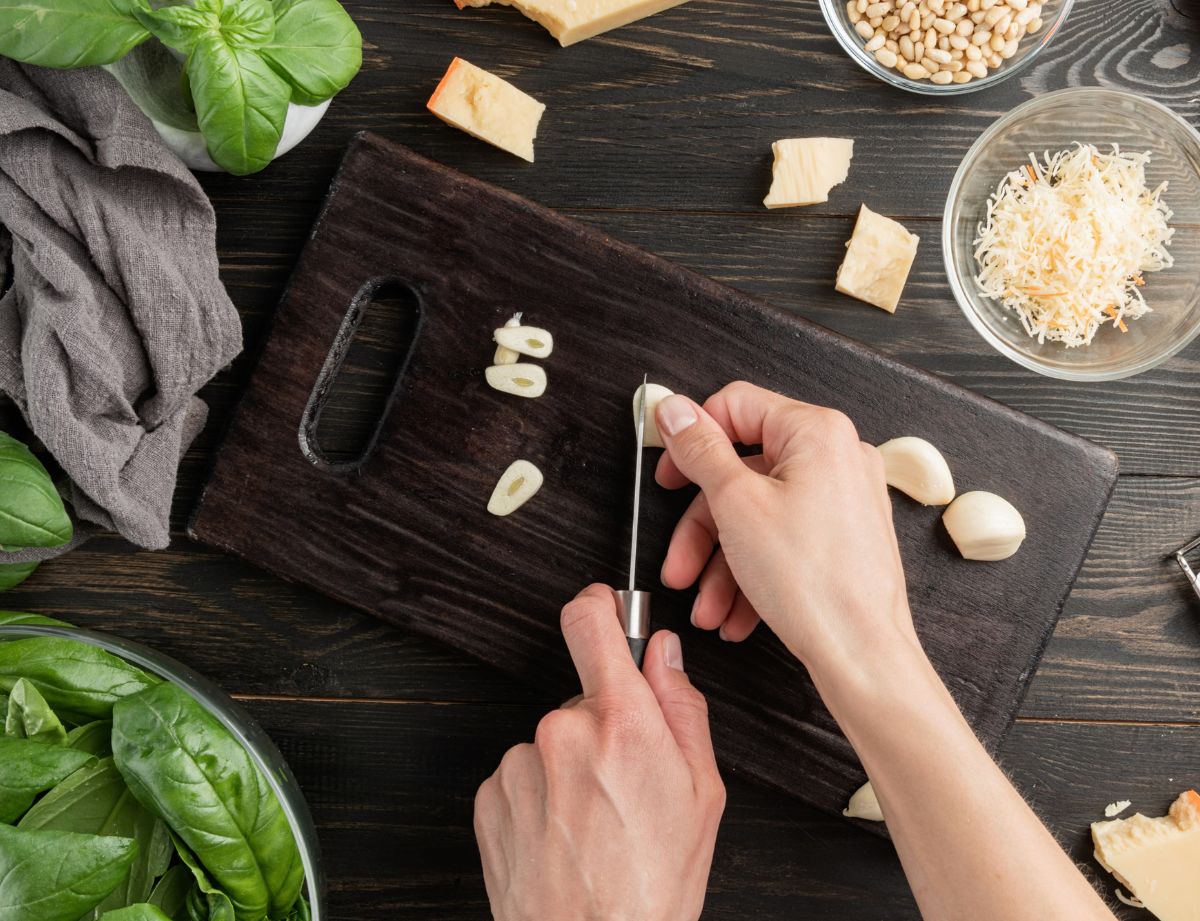 - Evitar que el pesto repita: Si queremos evitar que nuestra salsa repita y nuestros invitados se acuerden de nosotros toda la tarde hay que quitarle al ajo la parte central, que es la que repite. Para ello partimos el ajo longitudinalmente y con la punta de un cuchillo extraemos el corazón del ajo.