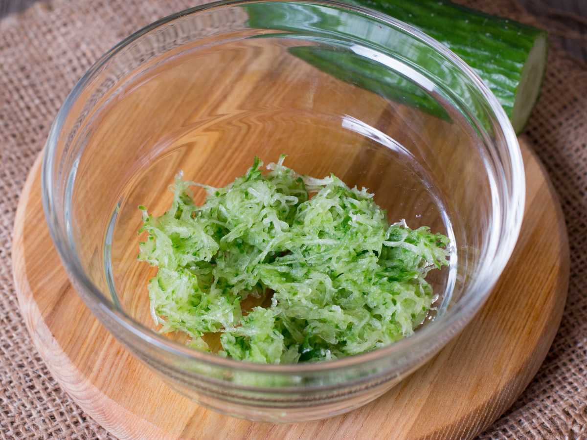 Lavamos el pepino, lo pelamos y lo rallamos con la parte gruesa del rallador.