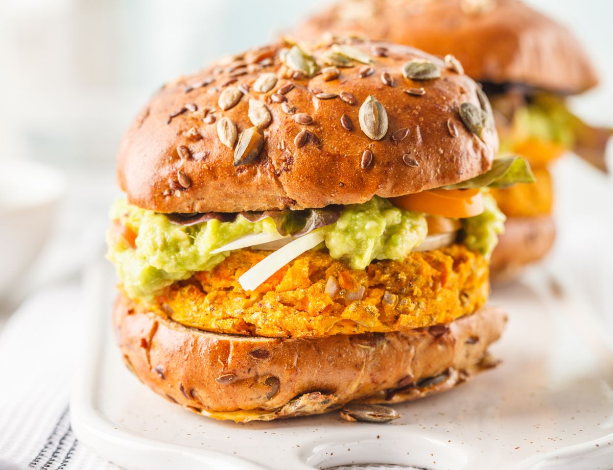 La salsa de aguacate aporta sabor y cremosidad a tus hamburguesas veganas, como esta hamburguesa de boniato casera, verás qué rica: