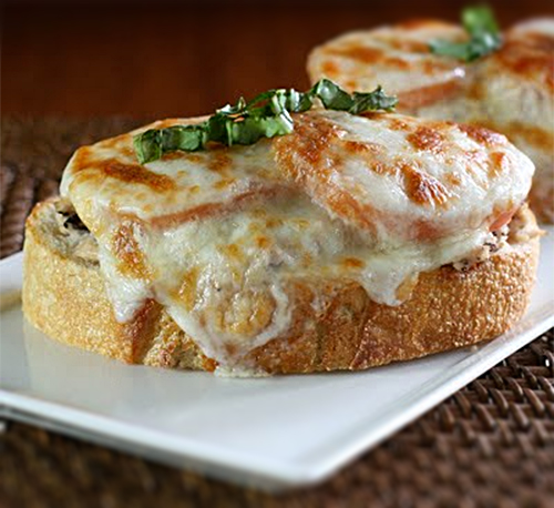 Ingredientes (para 4 personas): 3 latas de atún al natural; 1/3 de taza de mayonesa; sal y pimienta; 8 rebanadas de pan rústico; 3 cucharadas de tomate frito; 8 rebanadas de queso provolone o cheddar