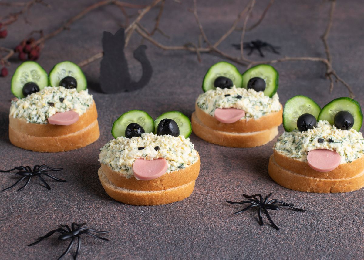 Y finalizamos con unos divertidos mini sandwiches para un aperitivo de Halloween, que rellenamos con queso crema mezclado con huevo cocido. Los ojos los hacemos con pepino y aceitunas negras sin hueso, y la boca con unos círculos de salchicha.