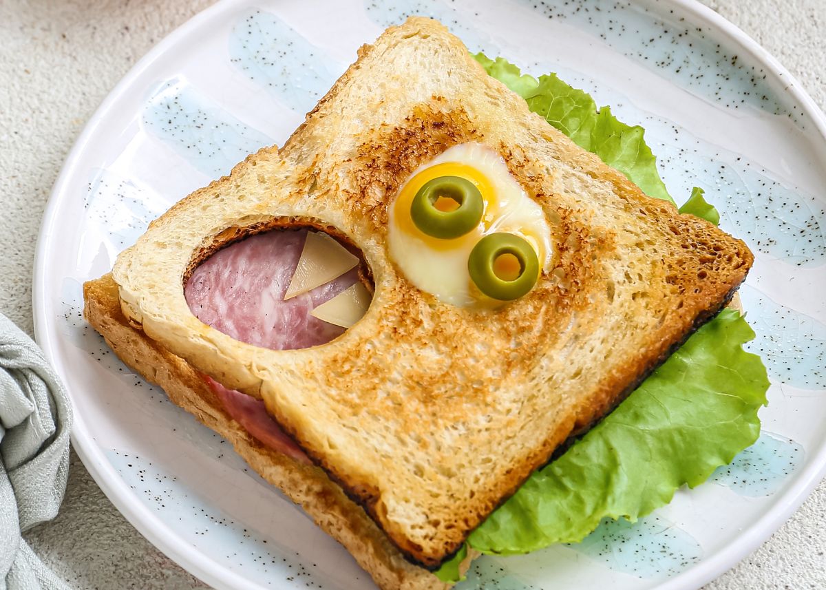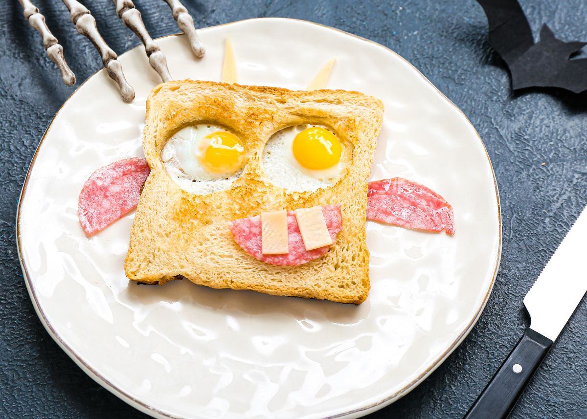 Preparación: Este sándwich de queso es perfecto para hacerlo en la freidora de aire o en el horno. Para hacerlo es necesario que hagas unos cortes previos en el pan de molde. Con un cortador redondo haz los círculos para los ojos en una de las rebanadas. Luego haz un corte en zig zag con las dos rebanadas juntas para que tengan la misma forma. Con cuidado abre las rebanadas e introduce el queso en lonchas. Cierra y coloca con cuidado un huevo de codorniz en cada ojo. Finalmente pon en el horno o la freidora de aire previamente precalentada, y calienta durante unos 5 minutos a 180ºC hasta que los huevos cuajen y el queso se derrita. Enséñale a tus hijos como se ve este sándwich de Halloween al separar las rebanadas ¡les encantará!