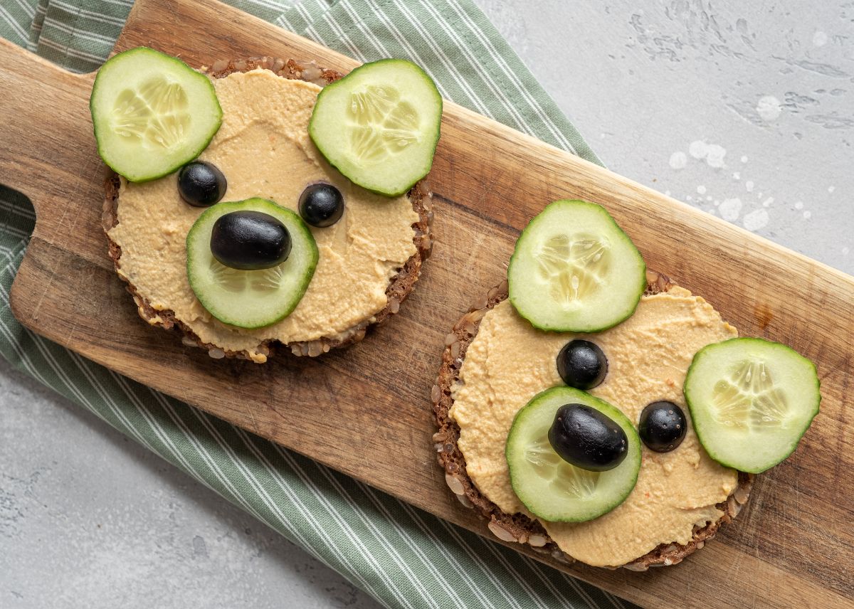 En la misma línea están otros sándwiches pero esta vez en versión salada, ya que están hechos con hummus casero y rodajas de pepino y aceitunas, ¿no te parecen adorables? Lo mejor es que además son muy saludables.