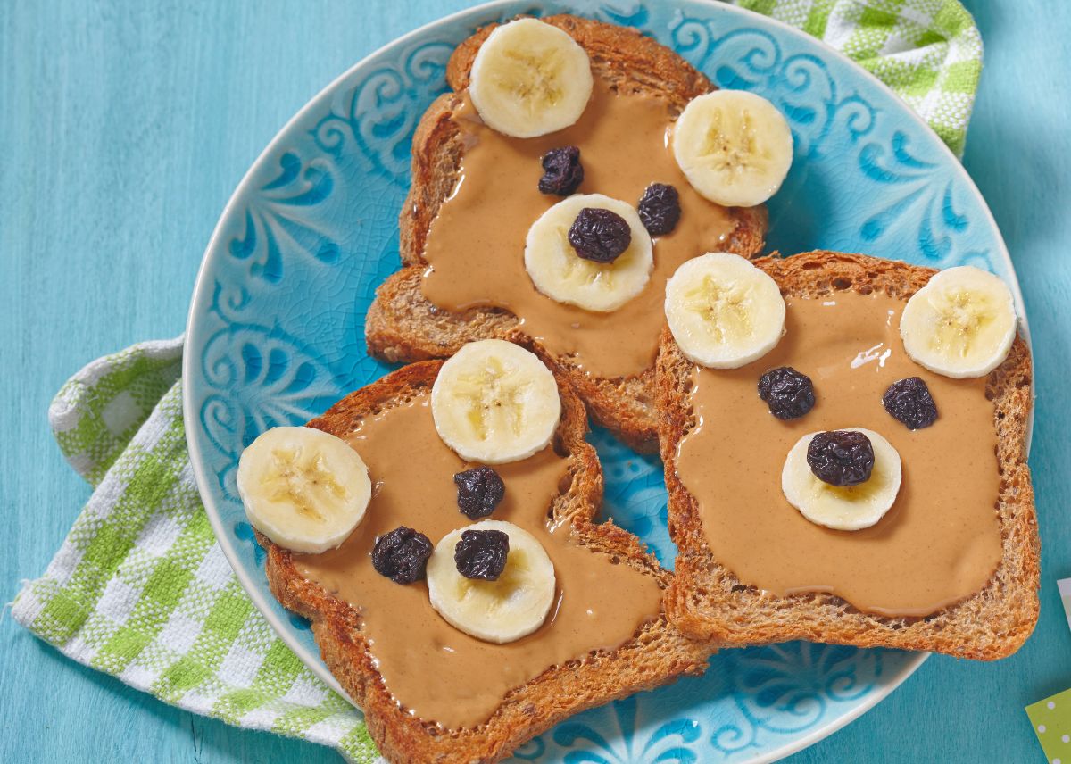 Lo mejor de estos sándwiches de ositos es que son realmente sencillos de realizar, ya que se trata simplemente de unas tostadas sobre las que untamos crema de cacahuete. Sobre ella colocamos unas rodajas de plátano y algunas uvas pasas para los ojos y nariz. ¡Rico y saludable!