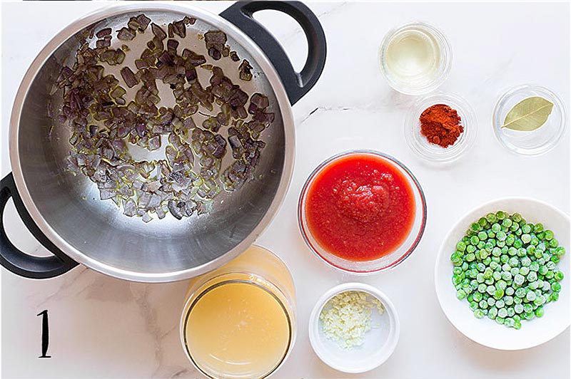 - Una vez esté caliente, añadimos la cebolleta, luego la hoja de laurel, el ajo en láminas, el pimiento rojo y el pimiento verde, y sofreímos durante unos 5-7 minutos hasta que la verdura esté casi frita.
