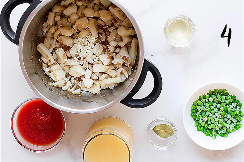 - Añadimos la sepia cortada en trozos y rehogamos durante unos 5 minutos.