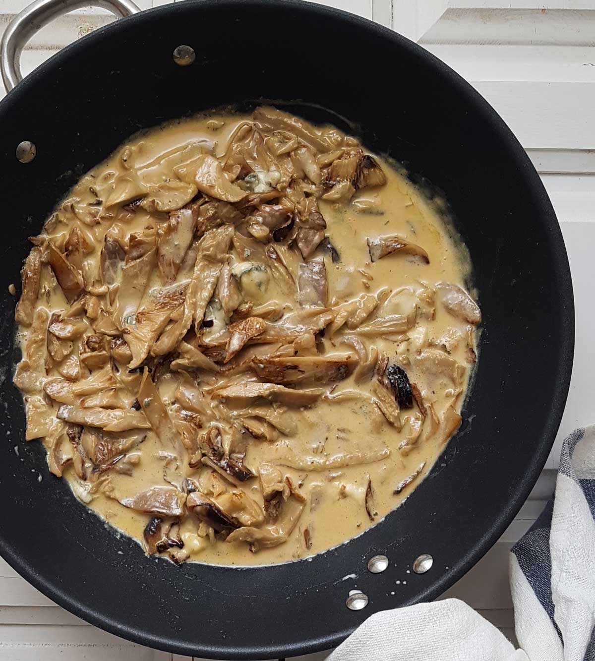 - En la sartén donde hemos salteado las setas volcamos la salsa de queso Roquefort y mezclamos bien hasta que la salsa se reduzca.