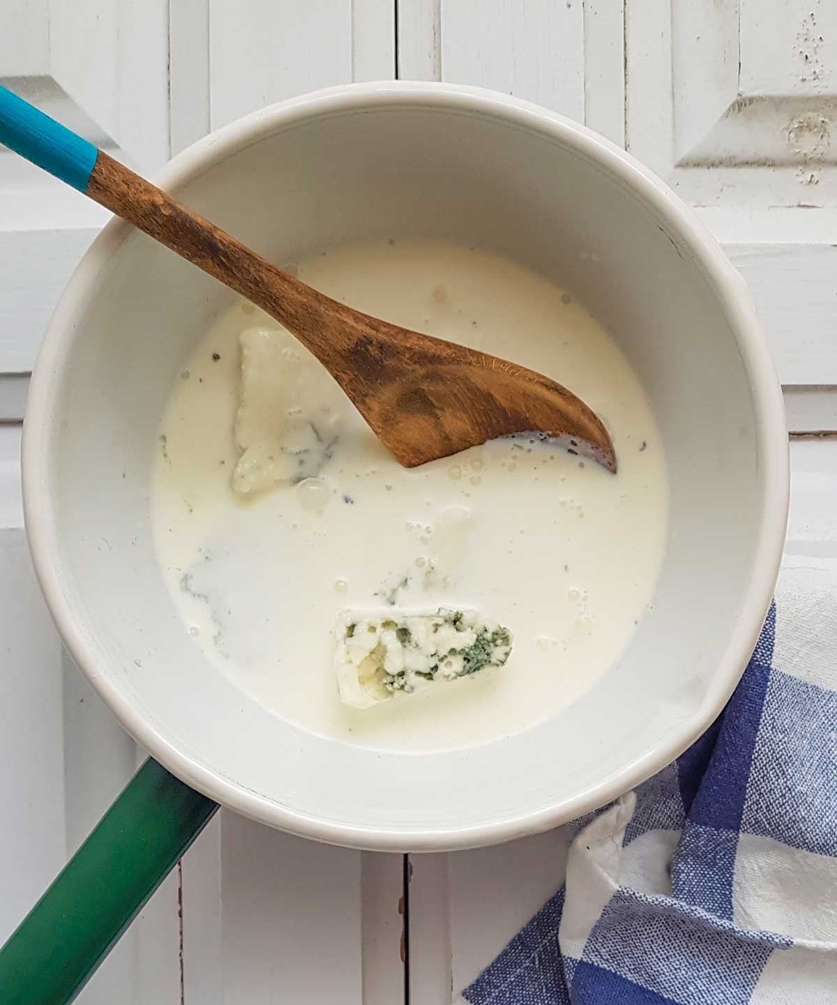 - En un cazo ponemos el queso azul y la nata líquida para cocinar