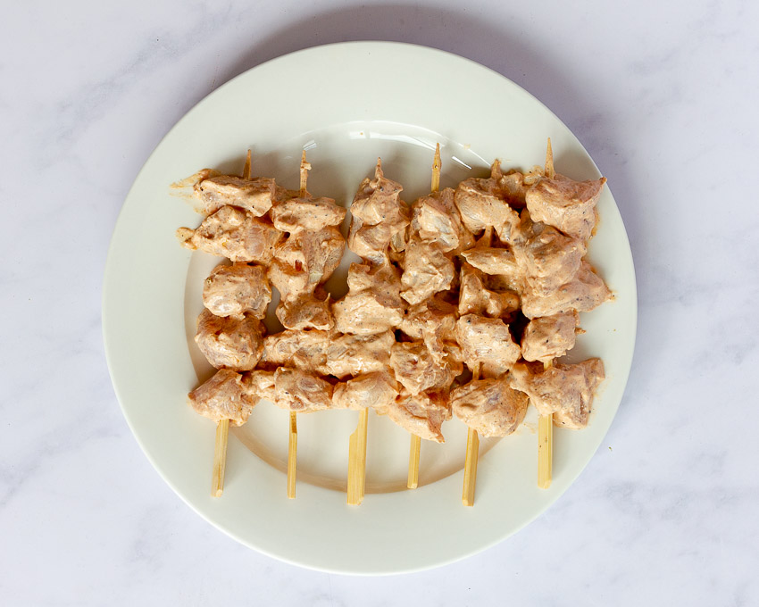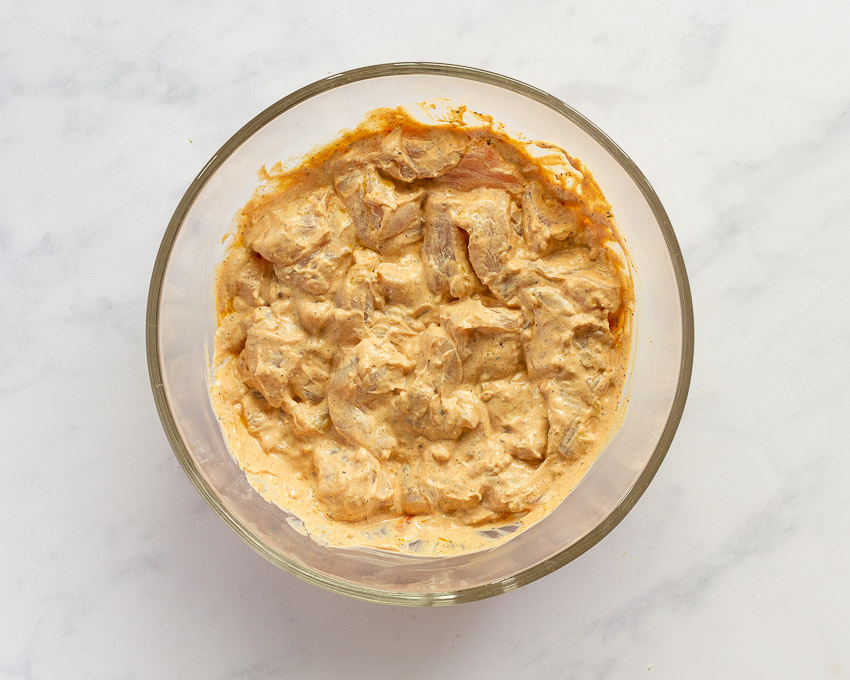 La clave de este plato es el marinado que consiste principalmente de tres ingredientes: el yogurt, el zumo de limón y el ajo, junto con especias como el pimentón, la canela, el jengibre o el comino que le confieren tanto el sabor como el color característico a este plato.