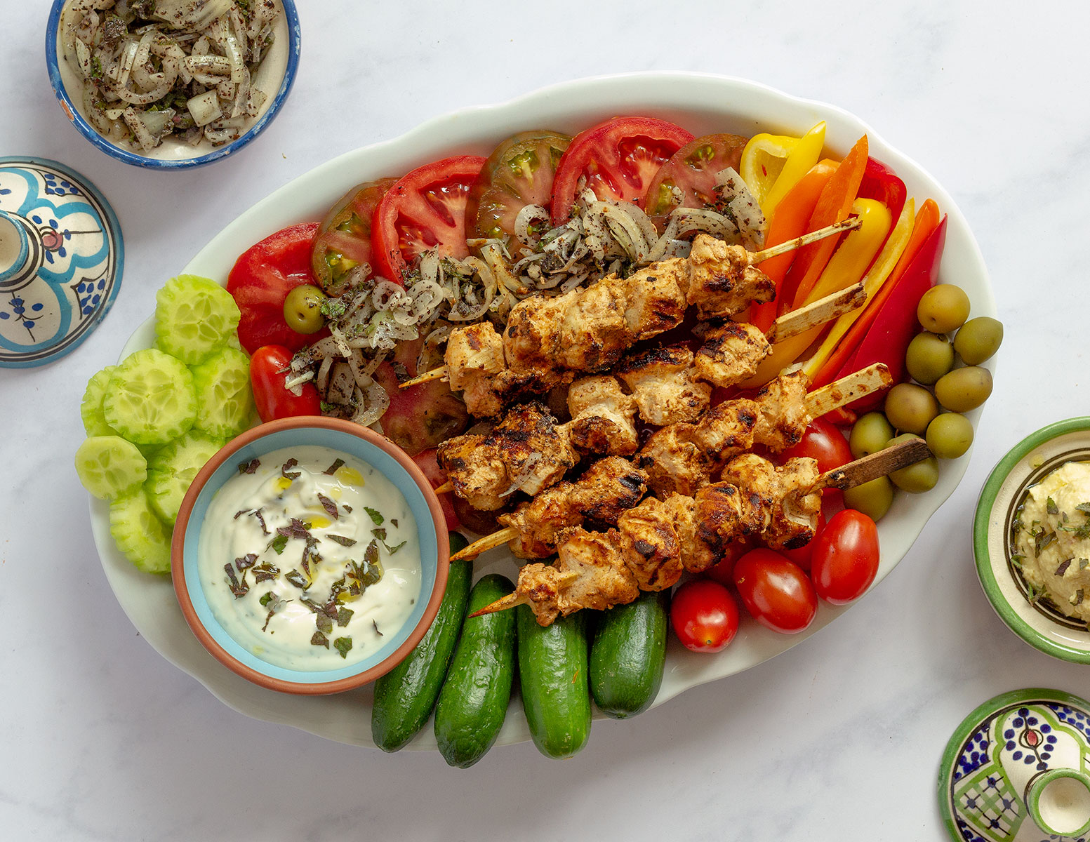 Acompañamos las brochetas de pollo con nuestro acompañamiento favorito, en este caso las hemos acompañado con rodajas de tomate, tomates cherry, pepino, aceitunas, pimiento, salsa de ajo y cebolla con sumac.