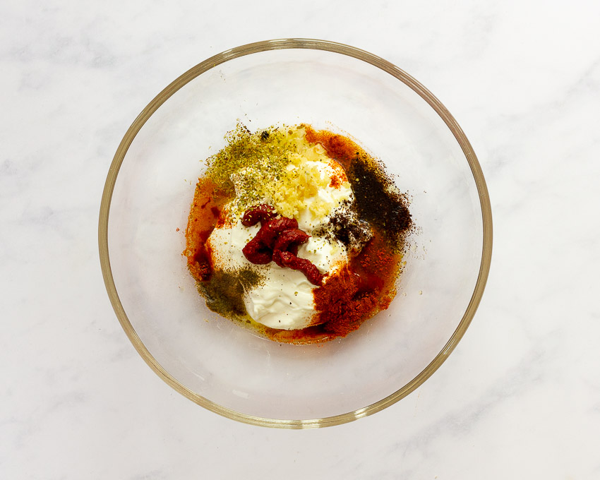 En el mismo bol añadimos el yogur, el aceite de oliva, el zumo de limón, el concentrado de tomate, la sal y las especias que queramos, en este caso hemos añadido pimienta, pimentón, comino molido, oregano, canela, nuez moscada y jengibre.