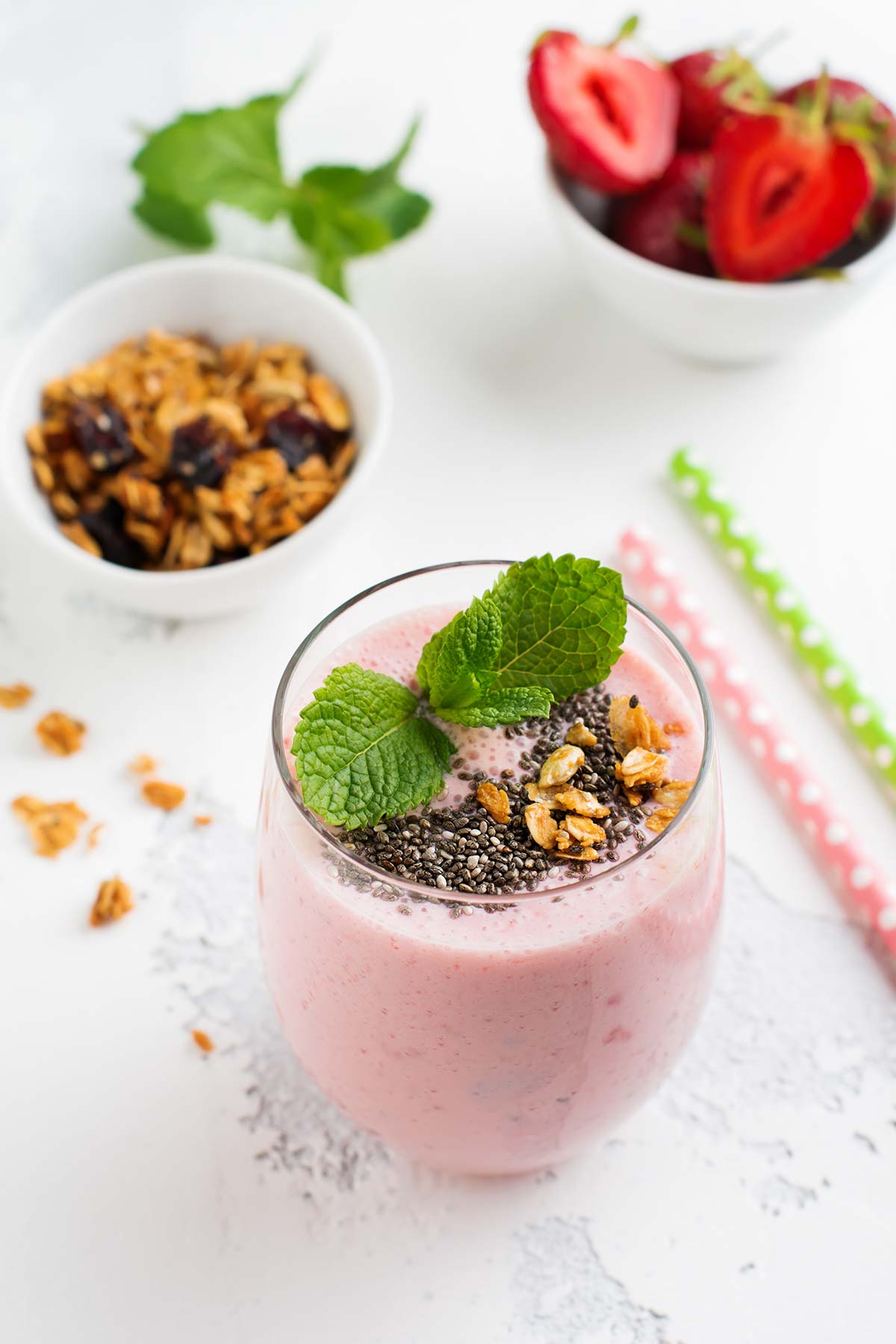 Ingredientes (2 raciones): 1 plátano maduro; 20 fresas; 200 ml de leche; 1 cucharadita de semillas de chía; un puñado de granola