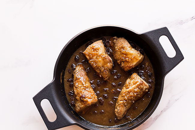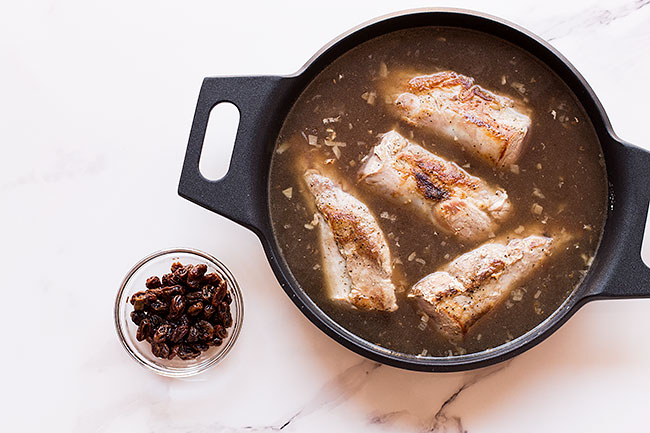 Mezclamos durante un minuto, añadimos los solomillos y el caldo de pollo caliente. Escurrimos las pasas y las añadimos a la salsa, dejamos cocinar a fuego fuerte, una vez rompa a hervir hasta que espese a nuestro gusto, aproximadamente 30 minutos .