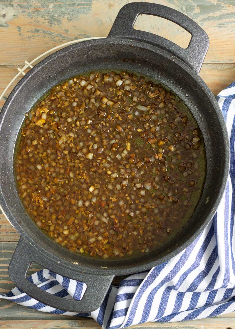 - Cuando la cebolla esté transparente añadimos el Pedro Ximénez y dejamos unos minutos para que se evapore el alcohol