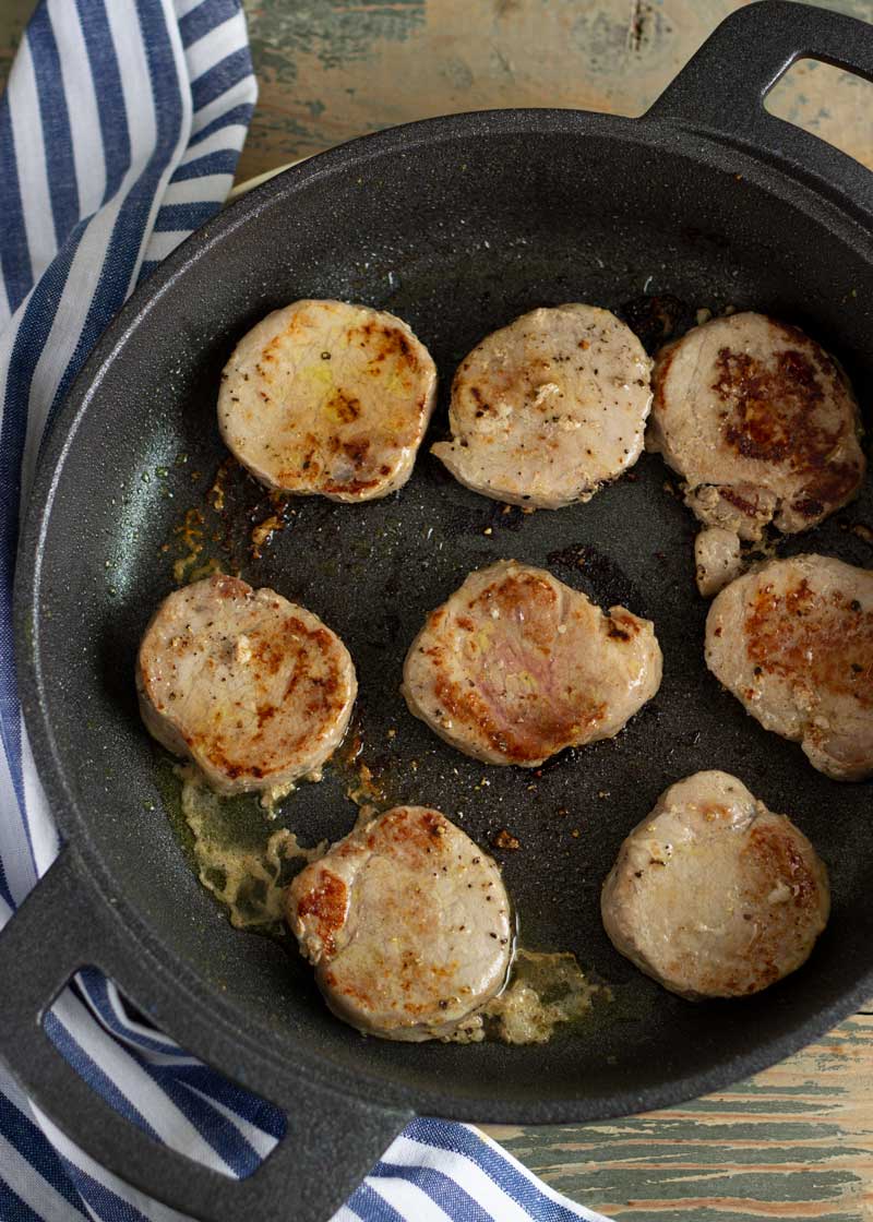 - En una sartén o cacerola amplia ponemos un poco de aceite, y sellamos a fuego alto los solomillos de cerdo cortados en medallones.
