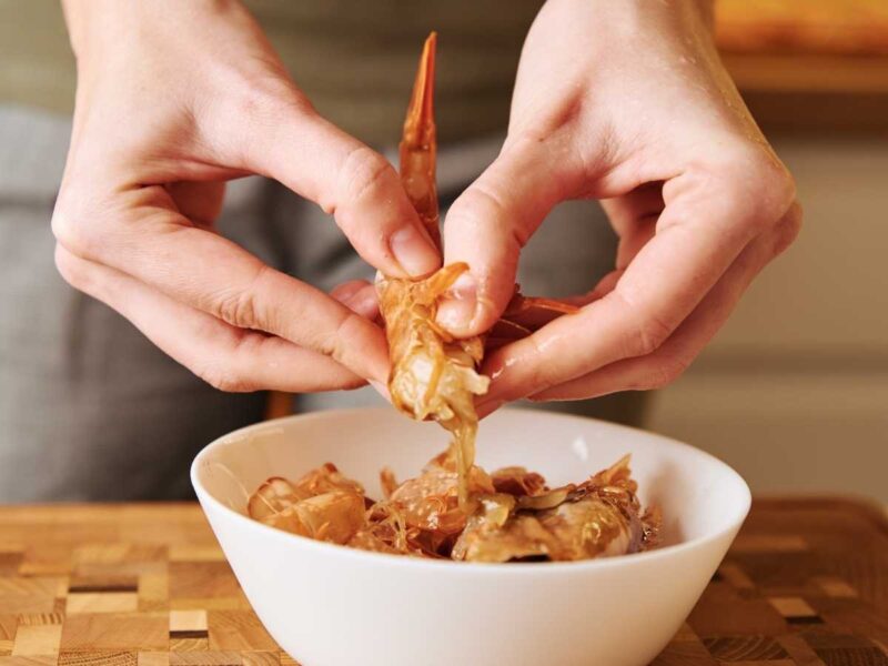 - Primero pelamos los langostinos, reservando las cáscaras., dejando algunos enteros si deseas usarlos para decorar al final. Reserva todo en el frigorífico hasta el momento de usar.