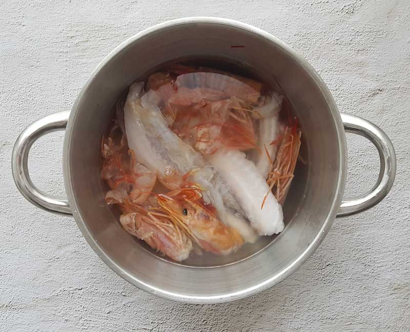 - En una olla pondremos la cabeza y espina del rape junto a las cáscaras de las gambas.
