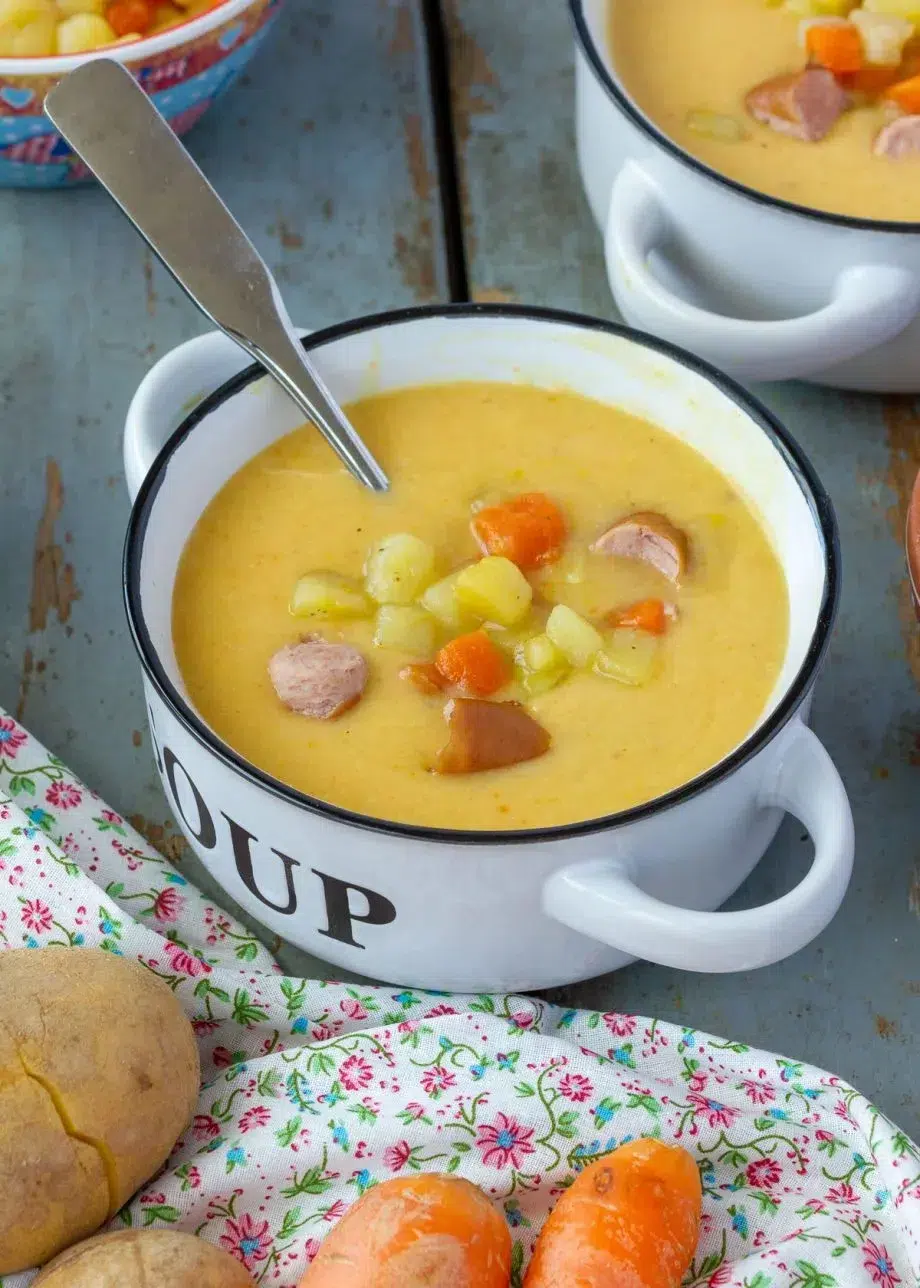 La sopa de patata alemana o kartoffelsuppe es una receta para sentirse bien que te calienta por dentro. Fácil de preparar, esta sopa de patata con salchichas es una receta clásica de abuela en Alemania, tradicional en todas las casas, y perfecta para la comida del día a día con los niños, ya que es nutritiva y a ellos les encanta.