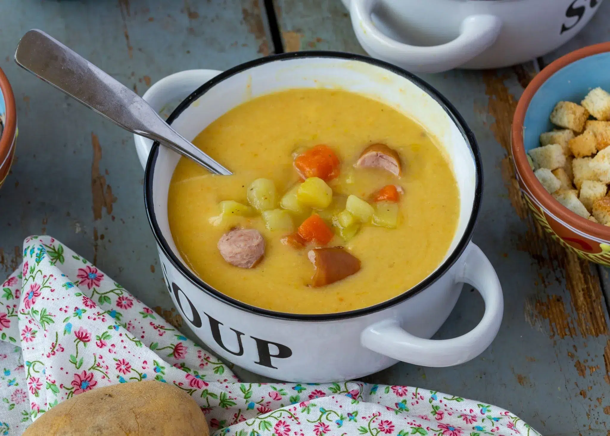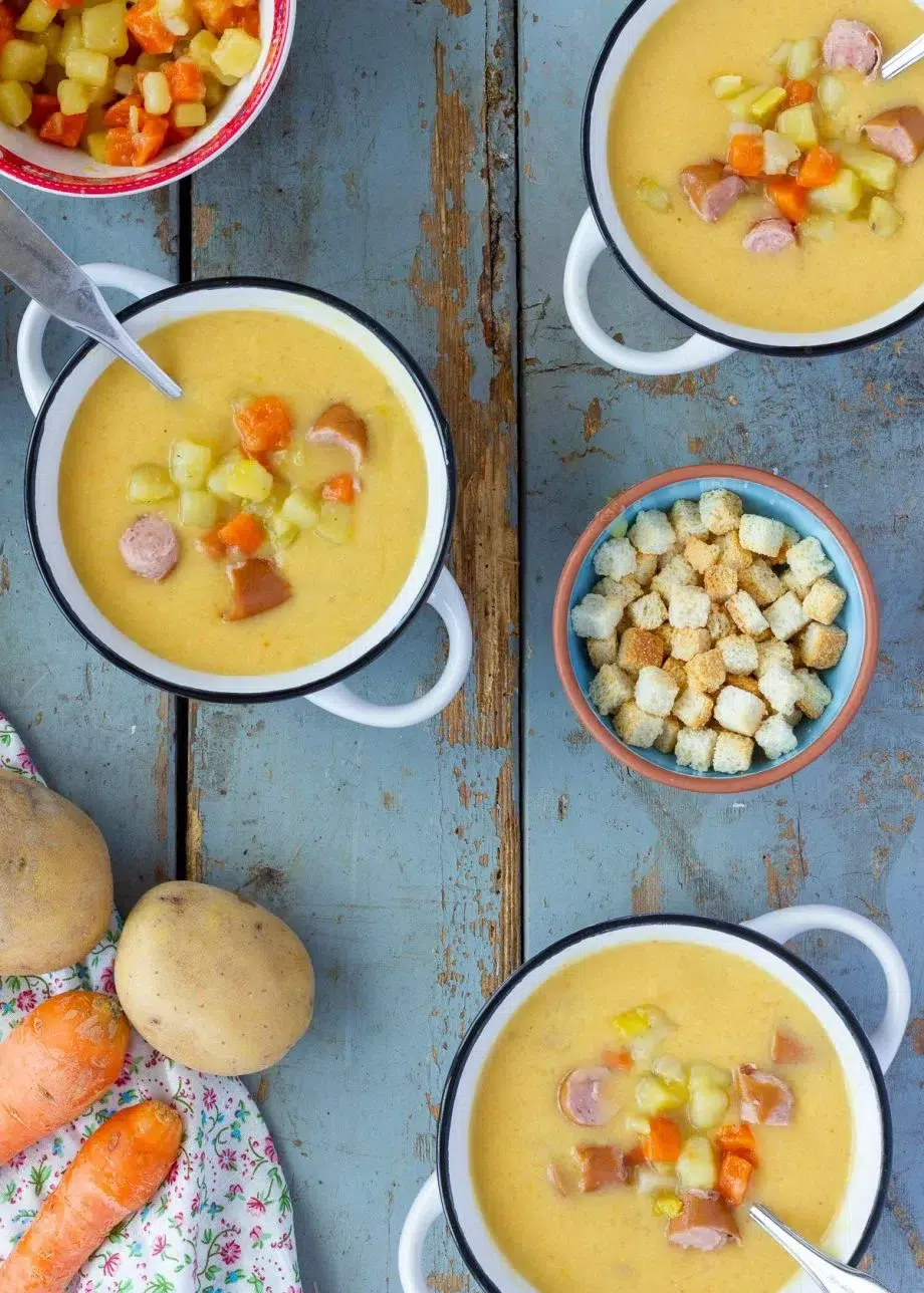 Las salchichas, por supuesto, no son imprescindibles, esta sopa cremosa de patata también se puede preparar vegetariana.