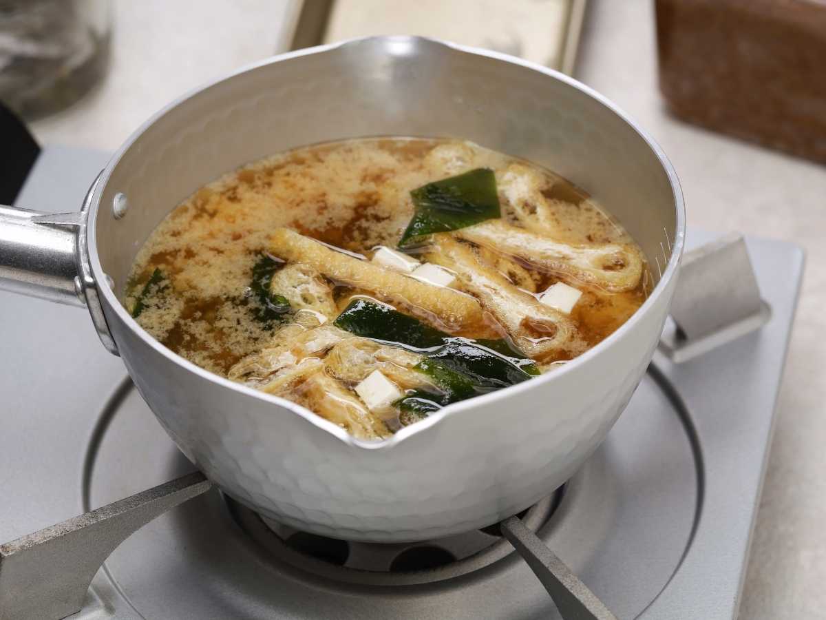 - Reduce el fuego al mínimo y agrega la mezcla de miso disuelto al caldo. Remueve suavemente para incorporar. Es importante no hervir la sopa una vez que se ha añadido el miso, para preservar sus enzimas y mantener el sabor delicado.