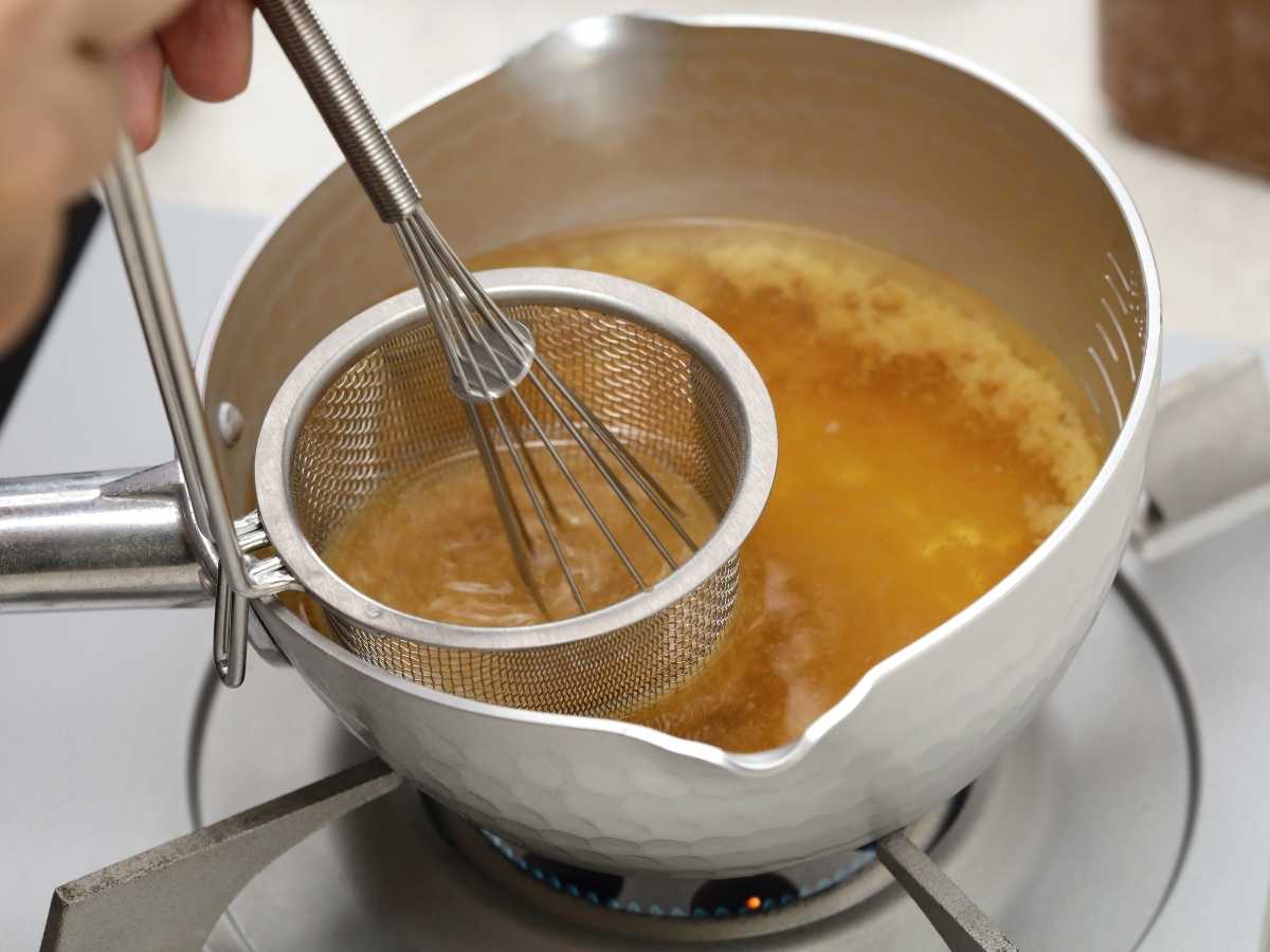 - Toma una pequeña cantidad del dashi caliente (aproximadamente 1/4 de taza) en un bol pequeño y disuelve la pasta de miso en él, removiendo bien hasta que esté completamente integrado y sin grumos.