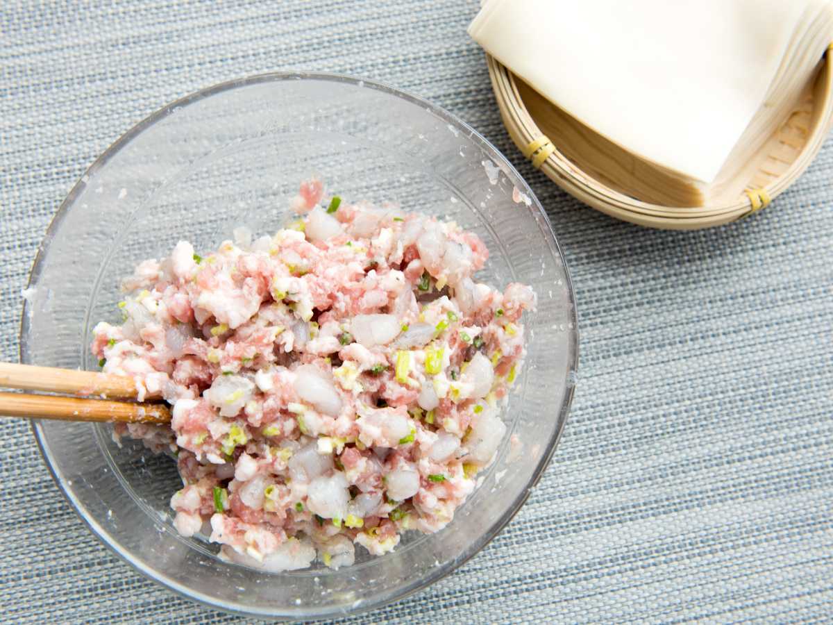 - Mezcla la carne de cerdo y los langostinos picados con la salsa de soja, el aceite de sésamo, el jengibre y las cebollas verdes.