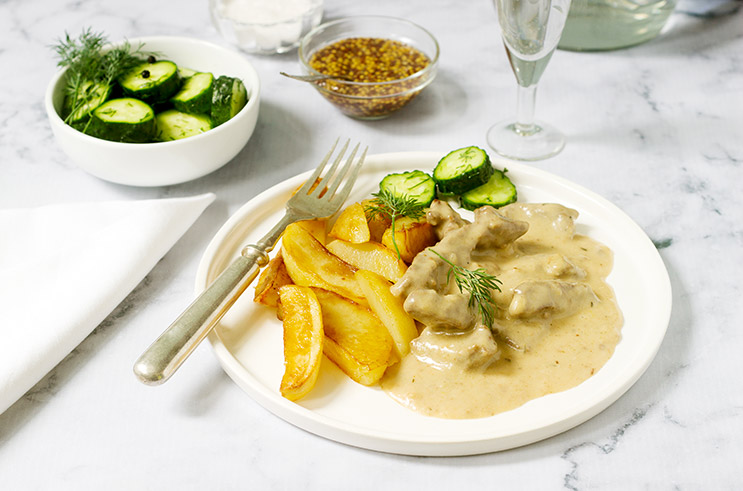 Vamos a preparar una receta de carne con nombre propio: la ternera Strogonoff o Stroganoff, ya que es conocida con ambos nombres. Se trata de una carne de ternera cortada en tiras que se sirve con una salsa de champiñones y nata (aunque la receta original lleva crema agria). Pero no se trata de una salsa de champiñones tradicional; el toque de mostaza y pepinillos en vinagre le da un sabor único, un poco ácido, diferente. Pero si no os animáis al sabor intenso de los pepinillos, podéis incluso no ponerlos.