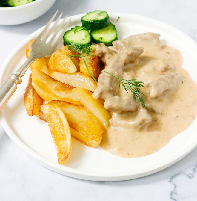 Es fundamental utilizar una carne de buena calidad, unos filetes tiernos, por ejemplo de solomillo, cortados en tiras finas. Por lo demás, los ingredientes son muy sencillos, como así también lo es esta receta de ternera Strogonoff, estamos seguros que os encantará.