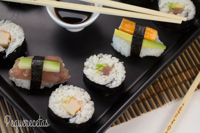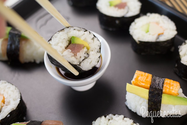 - Maki: es el que más conocemos los occidentales, y el que hemos preparado con nuestra receta. Es decir, arroz y pescado crudo, con otros ingredientes, enrollados en una alga noru.