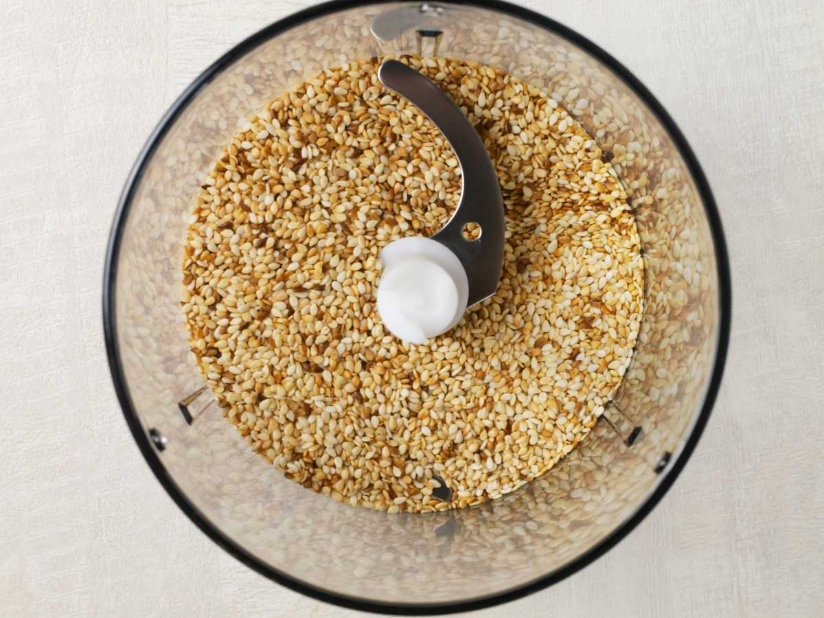- Coloca las semillas de sésamo enfriadas en un procesador de alimentos o licuadora de alta potencia.