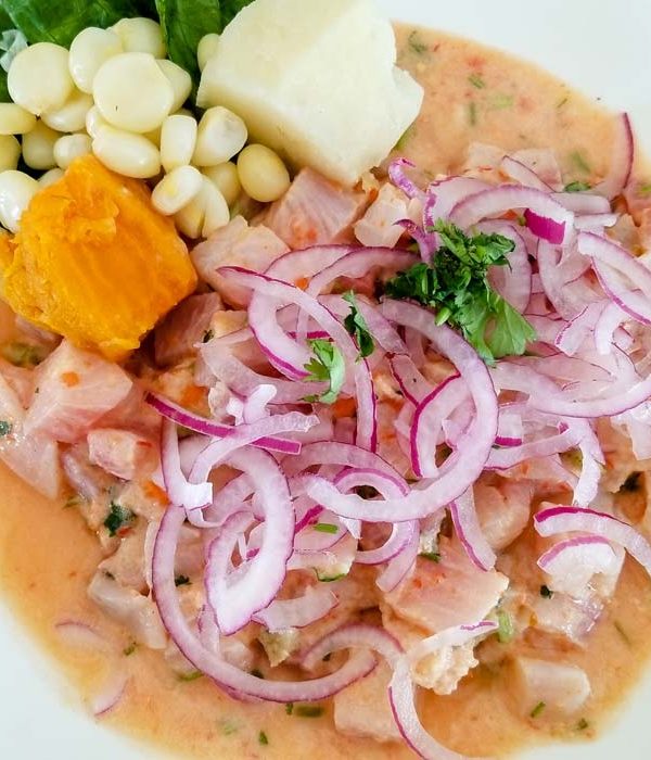 Ingredientes: 1 kg de pescado blanco; 6 limas y 4 limones; 2 cebollas moradas; cilantro fresco; 1 cdta. de ají amarillo o ají limo fresco; 1 cdta. de sal; pimienta blanca; maíz cocido o choclo; 1 boniato
