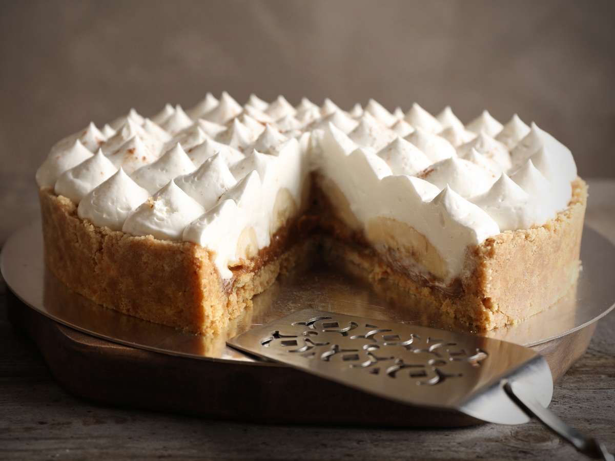 Se trata de una tarta elaborada con plátanos y dulce de leche o toffee (el nombre “Banoffee” viene de la combinación de las palabras “banana” y “toffee”), sobre una base de galletas trituradas y mantequilla, y coronada por una generosa capa de nata o crema batida.